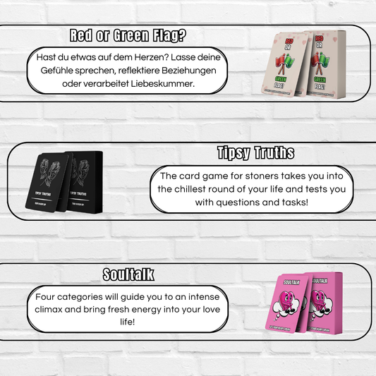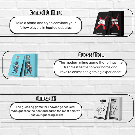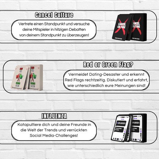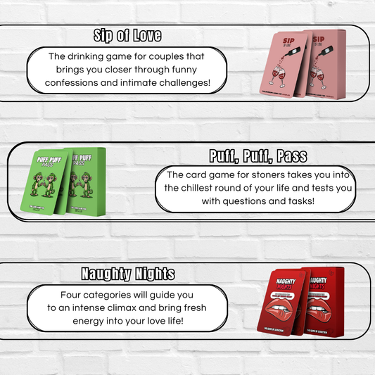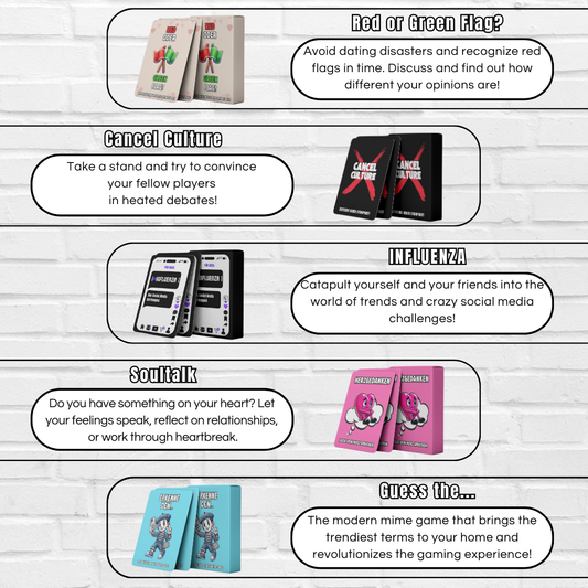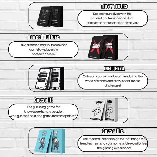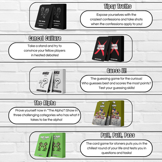 Can’t decide? No problem! With our All-in-One Bundle, you get all of our card games and save over € 180! Get the ultimate fun package and never have a boring party again.