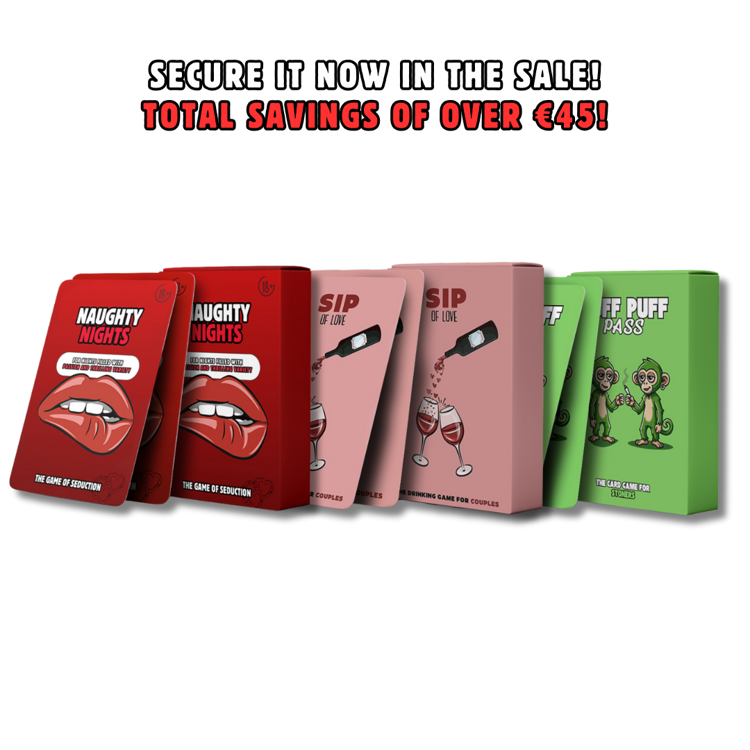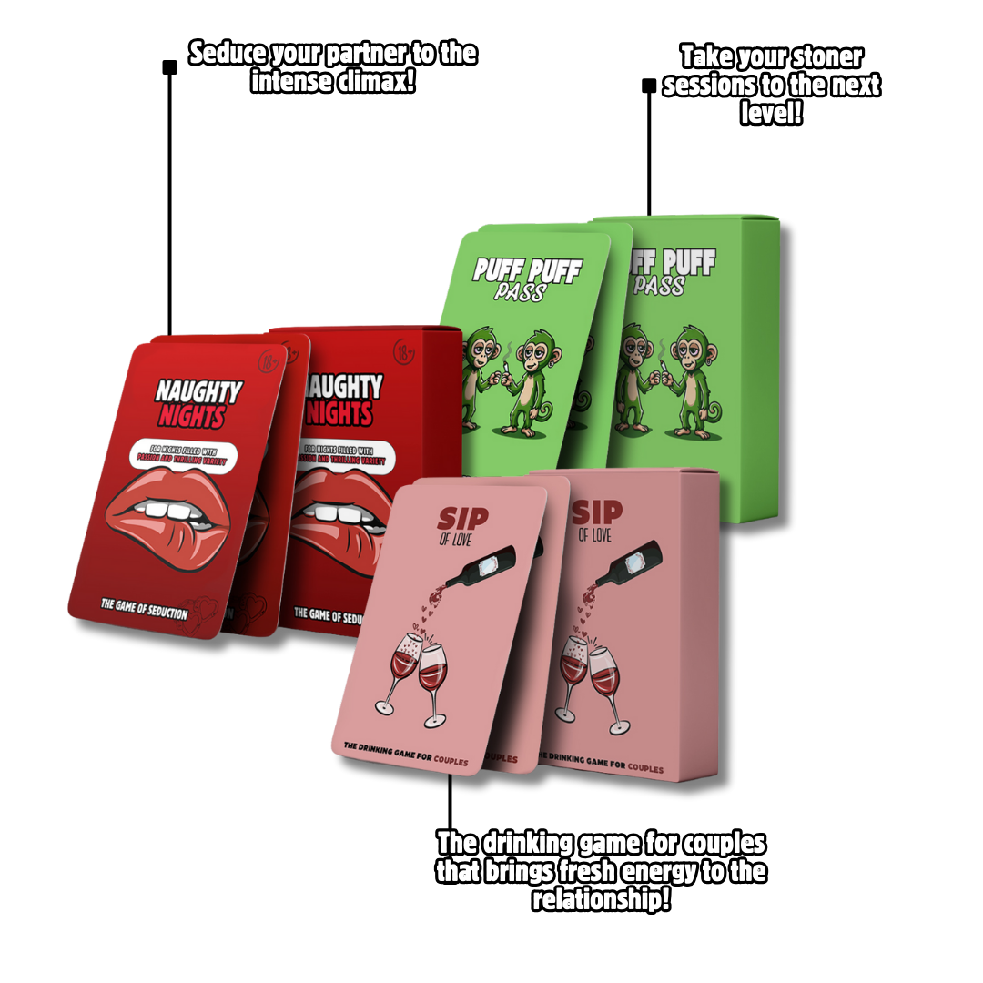 The Love & Chill Bundle contains three exciting card games and an exclusive e-book, perfectly suited to help you first relax and then ignite your senses. Indulge in fun and sensual challenges before fully giving in to passion.