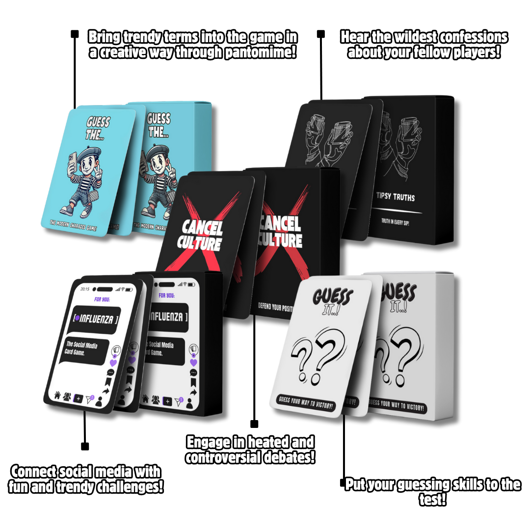 With our bundle, you’ll get the perfect mix of fun, excitement, and unforgettable moments. Whether it’s drinking games, funny challenges, or cool cocktails – this set brings variety and ensures every party is unique!